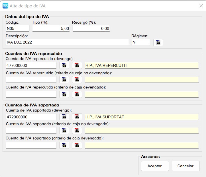 • Dado que la aplicación del nuevo tipo no es universal y tiene un ámbito de fechas de aplicación, el tipo de IVA no se da de alta de forma automática en SBConta.NET. Si lo precisa deberá acceder a la opción IVA-Tipos de IVA y dar de alta el mismo (código N05, régimen N, porcentaje 5%).