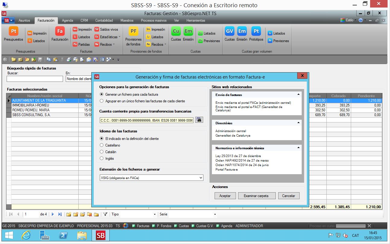 EL NUEVO MÓDULO DE GENERACIÓN DE FACTURAS EN FORMATO FACTURA-E NO SE INCLUYE CON LAS LICENCIAS ESTÁNDAR DE SBGESPRO Y DEBE CONTRATARSE DE FORMA ADICIONAL. SI ESTÁ INTERESADO PÓNGASE EN CONTACTO CON NUESTRO DEPARTAMENTO COMERCIAL.