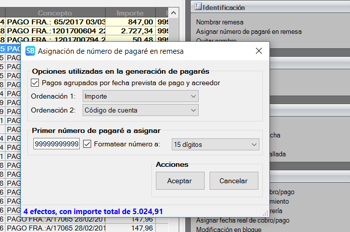 • Se ha añadido una nueva utilidad en el módulo de pagos titulada "asignar número de pagare en remesa". Tal y como indica su nombre, permite asignar de forma totalmente automática el número de pagaré o cheque generado por el programa para un conjunto de efectos. Contempla múltiples sistemas de ordenación y la agregación de efectos por fecha de vencimiento y cuenta del acreedor.