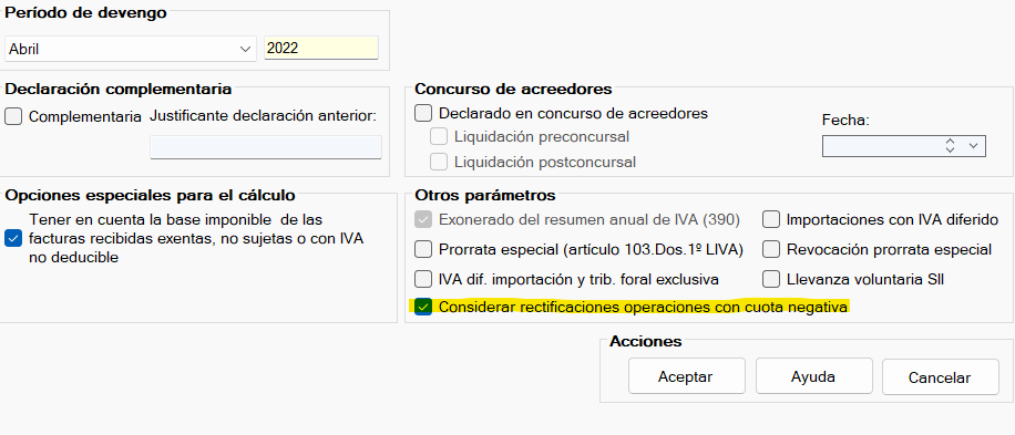 A efectos de ser coincidentes con este criterio, SBConta.NET incluye a partir de esta versión, una opción que permite que todas las facturas con cuota negativa se incluyan en las casillas de rectificaciones, estén informadas o no como facturas rectificativas.