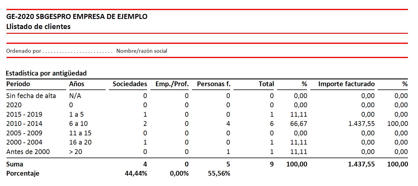 • Se añade un nuevo listado en el menú de impresión del maestro de clientes: clientes por antigüedad. Dicha estadística muestra el número de clientes y su facturación tramada en intervalos de años según su fecha de alta. El listado también incluye una estadística similar en función de la fecha de nacimiento de las personas físicas.